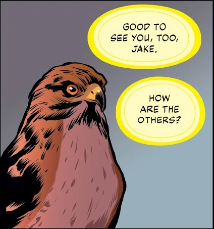 "Tobias' form was chosen because red-tails are among the most common hawks in the U.S. I liked thinking that kids driving with their folks across Kansas or wherever would daydream that they were seeing Tobias. Probably should have made him a turkey buzzard, they're so ubiquitous. I knew right from the start I would trap Tobias in morph, by the way, never a doubt. Had to be. I knew it would drive some readers crazy, but I also knew they'd want to know more."