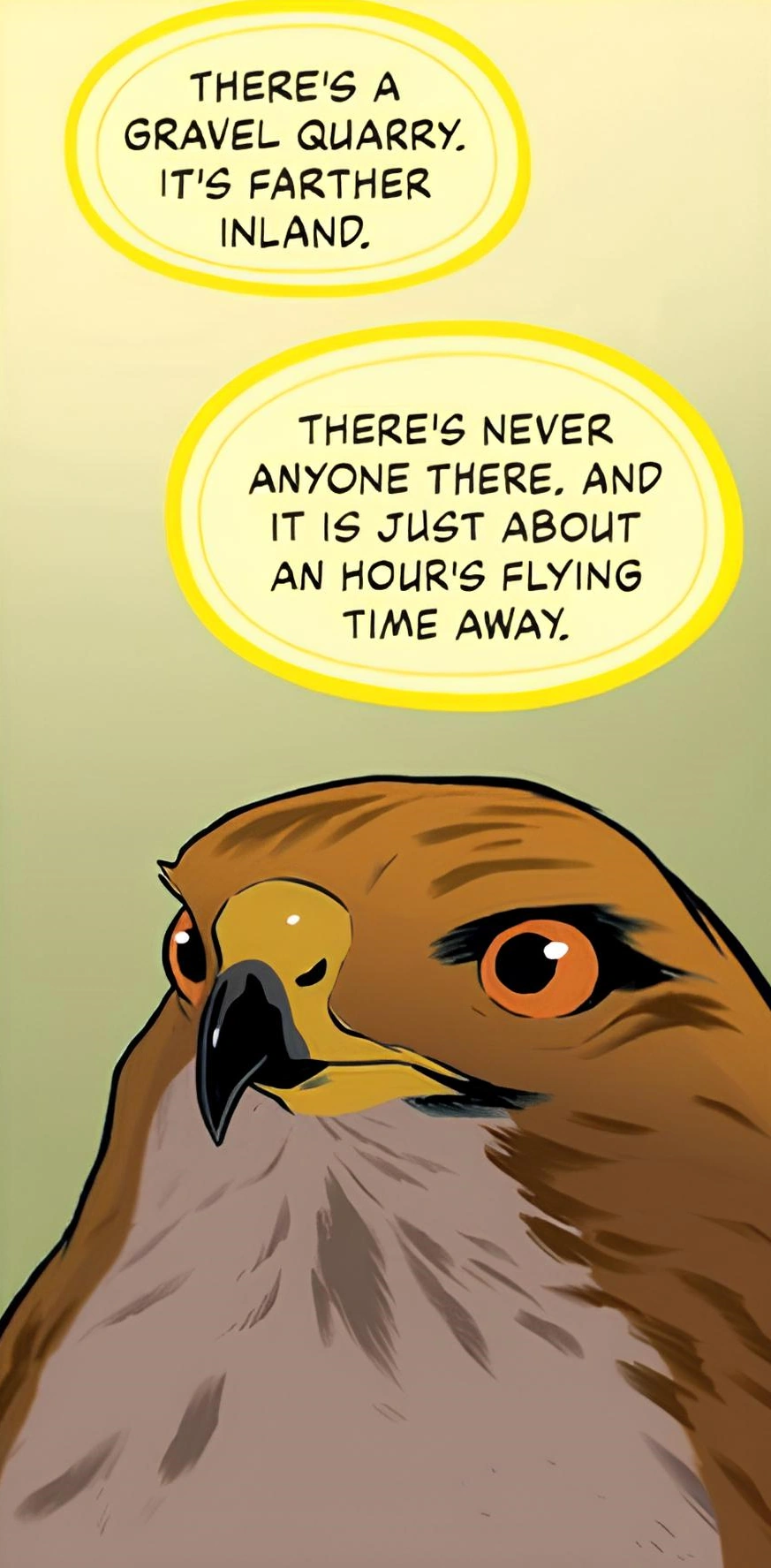 Tobias continued to live as a red-tailed hawk and spent his days flying alongside cars while using his raptor vision to spot their speedometer, this granting him the ability to mentally clock his own flying speed. Tobias then began experiencing dreams of a voice in the ocean calling to him, although he kept it to himself. One night, around midnight, he flew to the Wildlife Rehabilitation Clinic on Cassie's farm. He noticed a squirrel scampering about and swooped down to kill it, although he was startled when the other animals in the barn started making loud noises as a fox had entered. The fox then chased the squirrel, who was Cassie in morph, with the latter using thought-speak to ask Tobias to save her. Tobias was stunned that the squirrel he nearly hunted was Cassie before swooping down and slashing at the fox with his talons, prompting the fox to run away. As Cassie began to demorph, Tobias noticed that someone was approaching the barn and warned Cassie that she still had a tail. Cassie's father Walter then entered the barn and told Cassie to return to the house before going back himself. Cassie then spoke about how she was having weird dreams with a voice calling to her, and Tobias added that the voice was coming from the sea. Cassie and Tobias then both realized that they were having the same dreams.