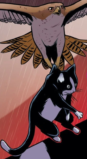 Since Rachel was hiding details from them, the Animorphs decided to take Rachel's carefree suggestion to heart. The four of them, minus Rachel, gathered down the street of Chapman's house before Rachel was to join them. Jake then morphed into a flea that he had acquired and was picked up by Cassie. When Rachel joined them, Tobias notified the group that Fluffer was not near the house and scoped out the vicinity before reporting that it was all clear. Rachel then morphed into the cat, after which Cassie secretly transmitted Jake's flea form onto Rachel's back. With Jake and Rachel inside the Chapman Residence, the other three Animorphs remained outside. Sometime later, Tobias heard Rachel's thought-speak calling out to him, yelling at him that they needed the real Fluffer to return home immediately. Tobias then flew towards the cat and clawed him on the head with his talon, scaring the cat. As the cat ran, Tobias started to chase Fluffer with his talons out, forcing Fluffer to run towards the Chapman house to hide from the hawk. Tobias noticed that "Chapman" had captured Rachel and Jake, who were placed inside Chapman's car before the man drove off. Jake then thought-spoke to Tobias, telling him to follow the car to its destination and to bring the others with him.