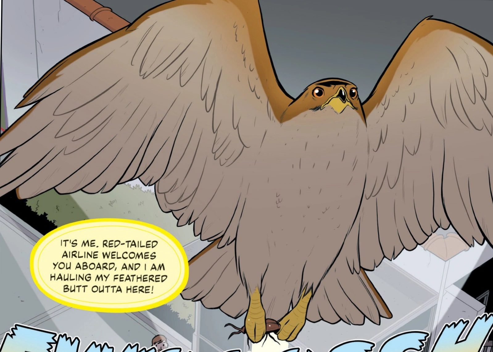 Rachel, now in elephant morphed, started stomping on convertibles and destroying them, redirecting both the attention of the employees and the film crew, as well as Dan Hawke. Tobias used the diversion to finish inputting the combination and opened the cage, and Price-Cut Polly flew free. Tobias and Rachel then retreated to the small patch of woods behind the dealership. As Rachel demorphed, she slightly berated him for performing the jailbreak during a live commercial filming; Tobias offered to take the blame for it, knowing that the other Animorphs would hear of it, although Rachel expressed her enjoyment at stomping cars. Rachel then made her way to the convenience store to buy flip-flops so she could take the bus home while Tobias flew away. Heading Downtown, Tobias spent his time soaring past skyscrapers. He then noticed something flying above his head; while it was invisible, with his hawk vision he could see that it was causing ripples in the air. Tobias began following it but failed to catch up as it moved away too fast, although he was able to discern that it had come from the mountains.