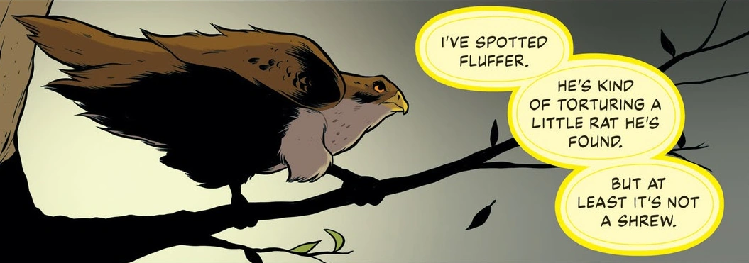 The Animorphs soon decided to infiltrate Chapman's house by morphing into Fluffer McKitty, his daughter Melissa's pet tomcat. As the four human Animorphs hid behind a hedge, trying to find a way to locate the cat, Tobias offered to find him. Upon locating Fluffer in a nearby alwn, Tobias flew back to his newfound friends and informed them of the cat's location. Rachel was impressed that Tobias was able to spot him, and Tobias in turn mentioned that with his eyes he could even see the plump mice and rats running around. This elicited a response of disgust from Marco, who declared that he could not be friends with someone who ate rats, which earned Marco words of anger from Rachel and Jake, prompting Marco to somewhat apologize. Tobias then led them to the lawn where Fluffer was, although Fluffer quickly jumped up into a tree. Rachel then asked Tobias to find her a mouse so that she could use it to lure the cat. Hunting for the first time, Tobias captured what he believed to be a baby mouse and delivered it to Rachel, although Cassie clarified that it was a shrew. The Animorphs began to doubt Rachel's plan to morph into a shrew to lure a cat out, and Tobias privately thought-spoke to Rachel, telling her to be careful as he did not want anything to happen to her. Tobias then watched as Rachel morphed into the shrew and succumbed to its instincts. As she was ignoring the human advice of her friends, Tobias used his thought-speak to reach out to her. When she continued to run, Tobias snatched her in his talons and managed to get her to reassert control, after which he deposited her back on the ground. Tobias watched as Fluffer was successfully lured down and captured, allowing Rachel to acquire the cat before they released him. Due to Rachel feeling unwell, the group decided to postpone their infiltration mission for another night.