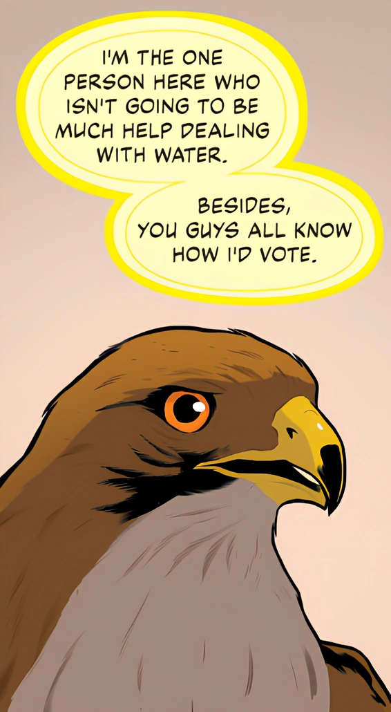 As Rachel claimed that they needed to inform someone important whom they could trust to handle the Yeerks since they were just kids, Tobias responded that they could not trust anyone since they could be a Controller, which would result in their deaths and humanity being doomed. When Tobias declared that they should fight, Marco retorted that Tobias could not even fight off the bullies at school. Rachel then came to his defense and stated that she would align with his vote of them fighting, much to Tobias' gratitude. The argument came to an end when Cassie and Jake decided that they should take some time to think before deciding, and the group disbanded. Tobias then walked into Cassie's barn and spotted a red-tailed hawk with a broken wing in a cage, whom he felt bad for. Tobias elected to acquire and morph the red-tailed hawk and flew away from the barn.