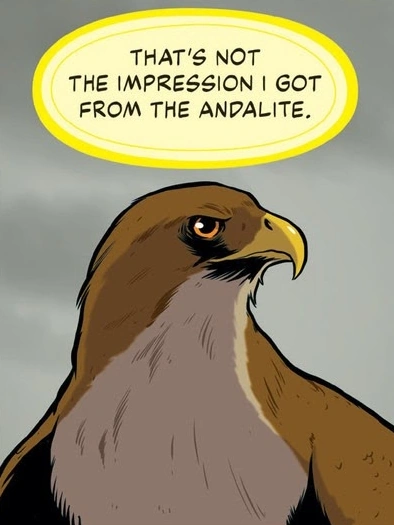While he was flying, Tobias experienced thermals for the first time and relished as he soared high in the sky. Sorting through the memories and visions that the dying princeElfangor had given him, Tobias learned that the Yeerks needed to return to a Yeerk pool every three days in order to feed from Kandrona rays. Tobias began looking at bodies of water from the air but was unable to discern which could be Yeerk pools. He then flew to Jake's house and entered through Jake's window. Demorphing, he informed Jake and Marco of the Kandrona and the Yeerk pool. When Marco asked what his next move should he locate one, Tobias confidently replied that they would simply destroy it as a means to fight the Yeerks. Marco then sneered that Tobias had never even fought for himself, Tobias was steadfast in his response that the Andalite had died for them and that he would fight for humanity even if Marco didn't.