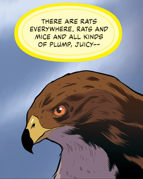 With the hawk mind in charge, Tobias flew to the meadow where he had killed the rat and established a territory for himself, building himself a nest in a tree and spending his days hunting prey. He then spent three days living as a true red-tailed hawk. While the hawk mind was dominant during the day, Tobias' human mind resurfaced at night, showing the hawk mind memories of his past life. However, Tobias' human mind wished to stay submerged and let the hawk be in control. On Friday, after thinking of Price-Cut Polly, Tobias decided to fly to the mountain lake area to see her. There, he spotted a bear cave where raccoons and skunks ran in to hide from predators such as himself, and noted that there were no bears living in the cave. He spotted Price-Cut Polly and observed as she failed to kill a baby raccoon.